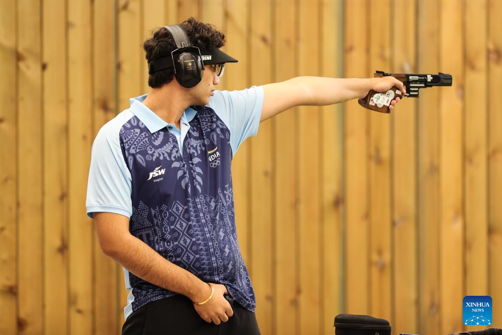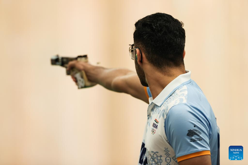 Adarsh Singh of India competes during the Men's Team 25m Rapid Fire Pistol of Shooting at the 19th Asian Games in Hangzhou, east China's Zhejiang Province, Sept. 25, 2023. (Xinhua/Shan Yuqi)