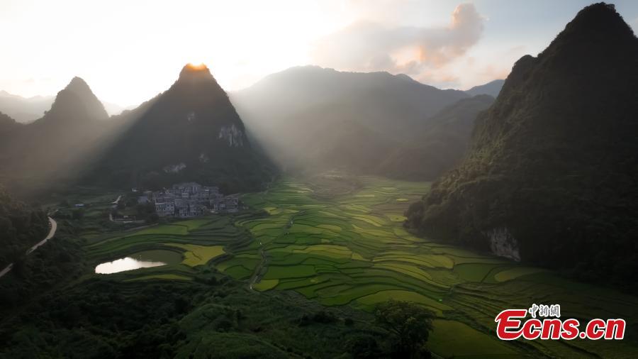 Picturesque scenery of terraced late rice field at sunset in Debao County of Baise, south China's Guangxi Zhuang Autonomous Region. (Photo: China News Service/Huang Shaojiang)
