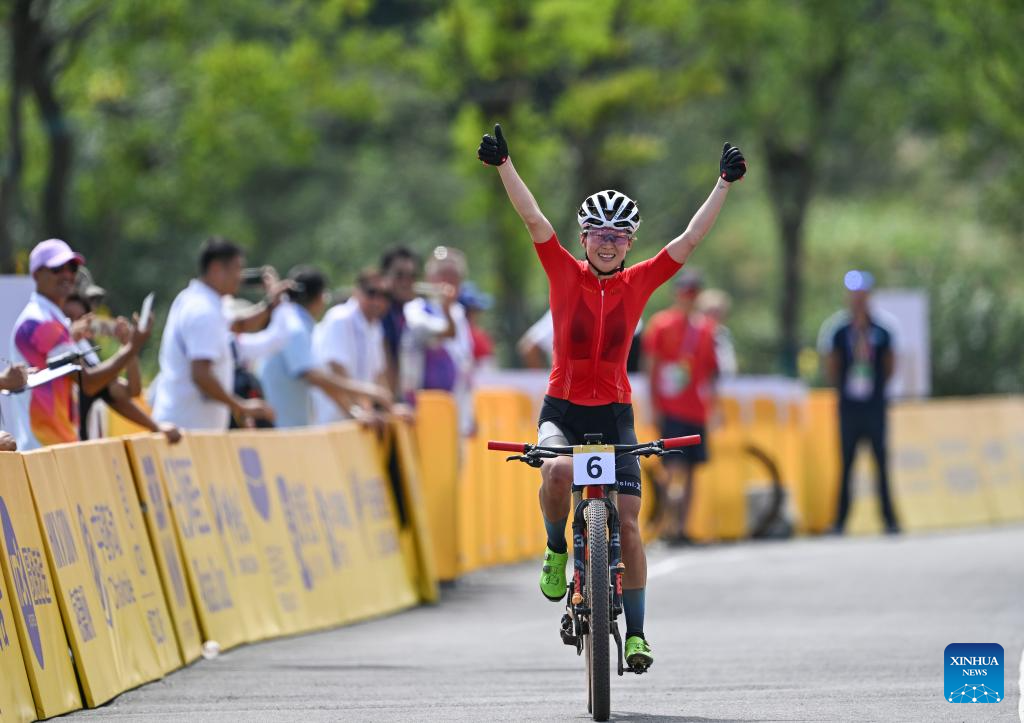 Ma Caixia of China celebrates after the Women's Cross Country Olympic of Cycling Mountain Bike at the 19th Asian Games in Chun'an County of Hangzhou, east China's Zhejiang Province, Sept. 25, 2023. (Xinhua/Hu Huhu)