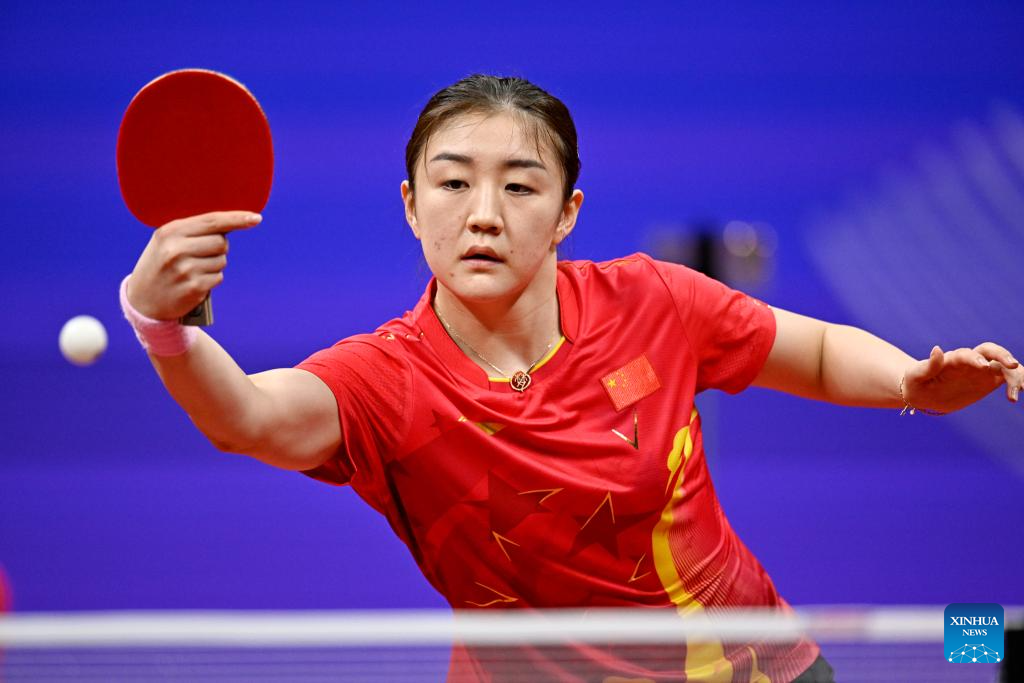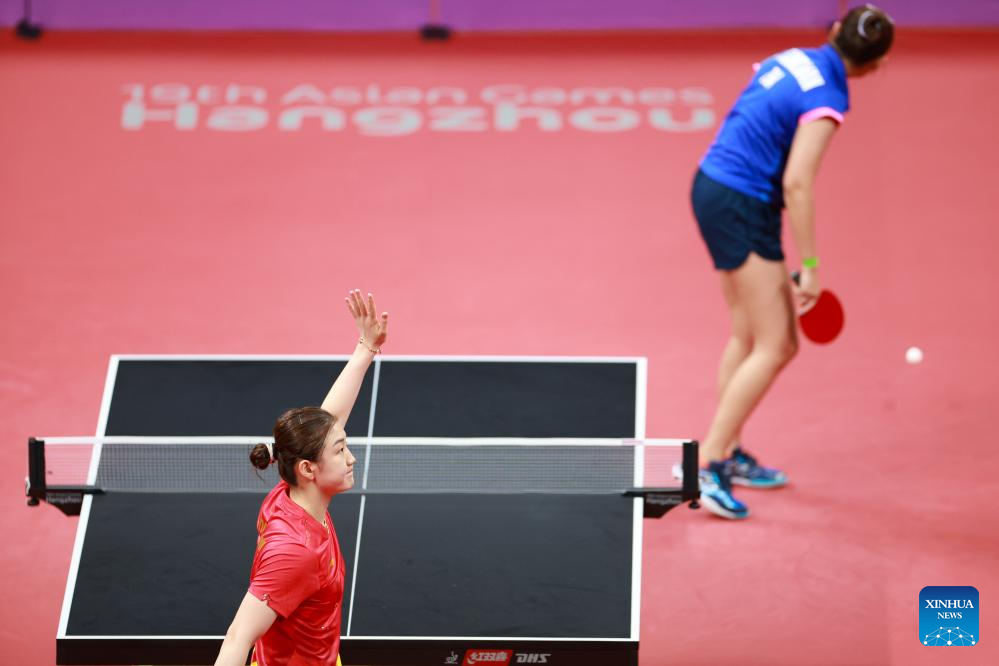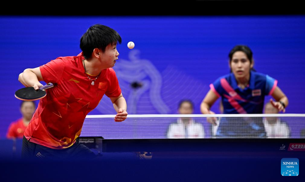 Wang Manyu of China competes during the Women's Team Semifinal Table tennis match between China and Thailand at the 19th Asian Games in Hangzhou, east China's Zhejiang Province, Sept. 25, 2023. (Xinhua/Liu Xu)