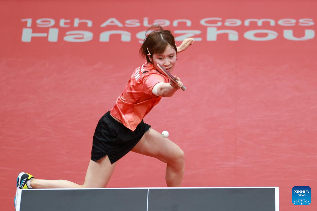 Hirano Miu of Japan hits a return during the Women's Team Semifinal of Table Tennis between Japan and South Korea at the 19th Asian Games in Hangzhou, east China's Zhejiang Province, Sept. 25, 2023. (Xinhua/Liu Xu)