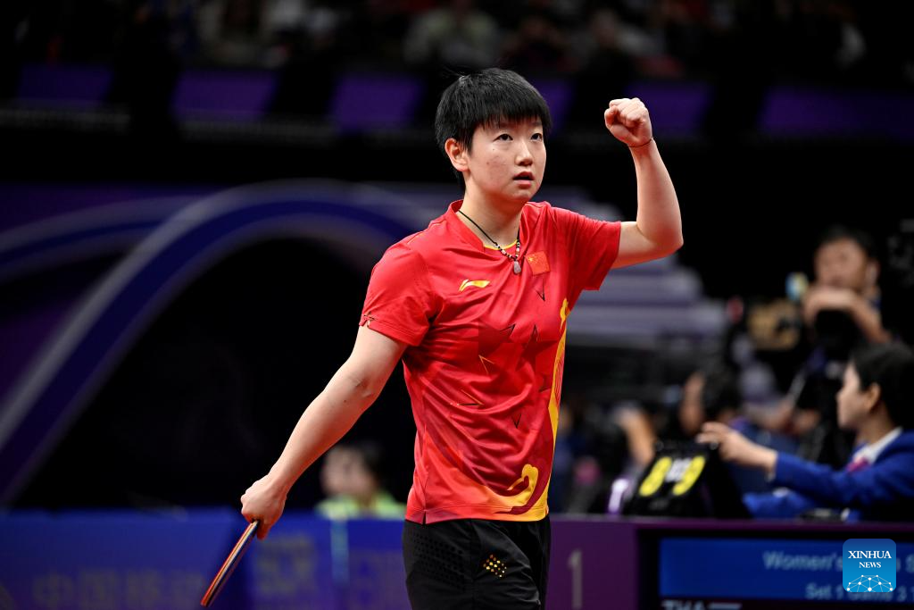Sun Yingsha of China reacts after the Women's Team Semifinal Table tennis match between China and Thailand at the 19th Asian Games in Hangzhou, east China's Zhejiang Province, Sept. 25, 2023. (Xinhua/Wang Peng)