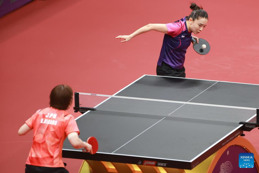 Hayata Hina (R) of Japan hits a return during the Women's Team Semifinal of Table Tennis between Japan and South Korea at the 19th Asian Games in Hangzhou, east China's Zhejiang Province, Sept. 25, 2023. (Xinhua/Liu Xu)