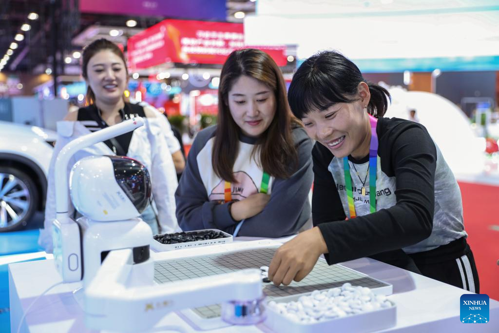 A staff member competes with a robot in a Go game, known as Weiqi in Chinese, at an exhibition during the 2023 Liaoning International Fair of Investment and Trade in Shenyang, northeast China's Liaoning Province, Sept. 25, 2023. The 2023 Liaoning International Fair of Investment and Trade kicked off here on Monday. Themed on jointly promoting new breakthroughs in revitalization and sharing new opportunities for development, this year's fair includes forums, exhibitions and business cooperation and promotion activities. (Xinhua/Long Lei)