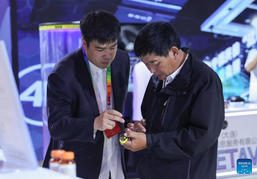 An exhibitor (R) introduces products during the 2023 Liaoning International Fair of Investment and Trade in Shenyang, northeast China's Liaoning Province, Sept. 25, 2023. The 2023 Liaoning International Fair of Investment and Trade kicked off here on Monday. Themed on jointly promoting new breakthroughs in revitalization and sharing new opportunities for development, this year's fair includes forums, exhibitions and business cooperation and promotion activities. (Xinhua/Long Lei)