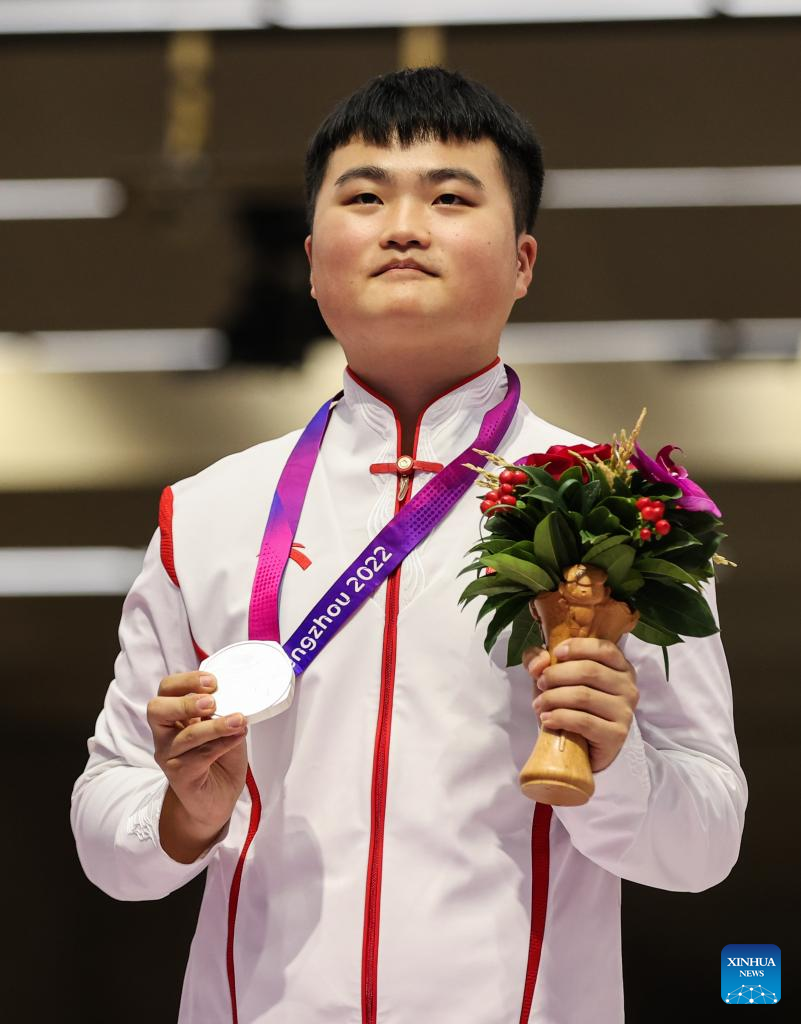 Silver medalist Liu Yangpan of China attends the awarding ceremony for the Men's 25m Rapid Fire Pistol Final of Shooting at the 19th Asian Games in Hangzhou, east China's Zhejiang Province, Sept. 25, 2023. (Xinhua/Shan Yuqi)