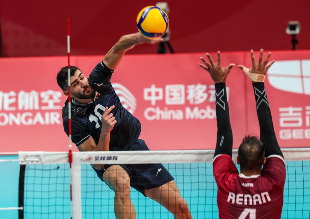 Amin Esmaeilnezhad (L) of Iran spikes the ball during the Volleyball Men's Semifinal between Iran and Qatar at the 19th Asian Games in Hangzhou, east China's Zhejiang Province, Sept. 25, 2023. (Xinhua/Zhu Zheng)