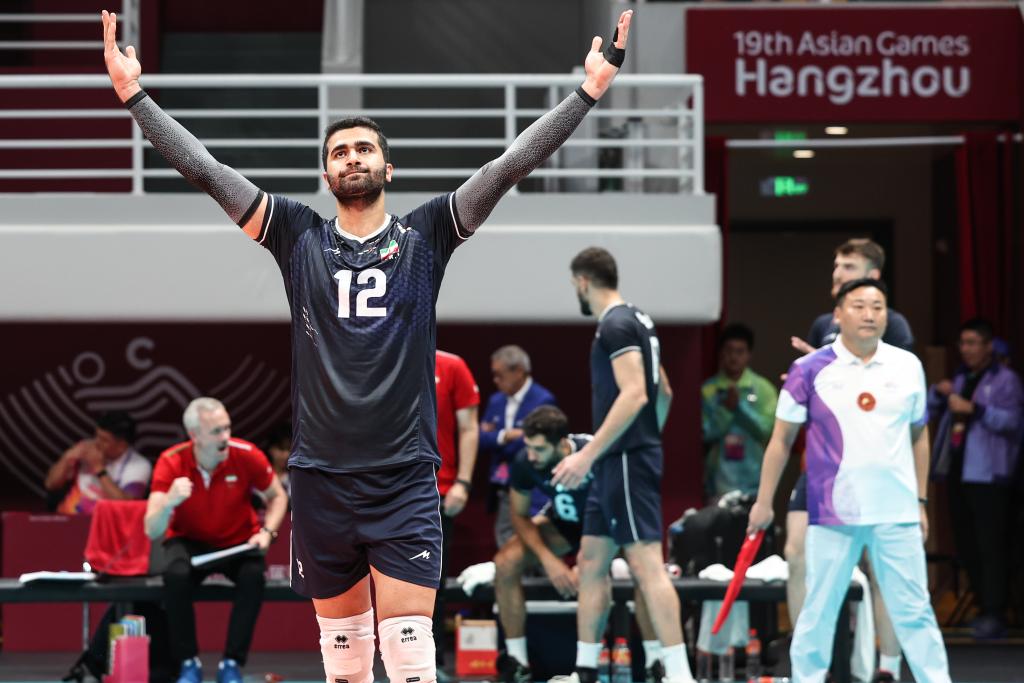 Amirhossein Esfandiar of Iran gestures to audience after the Volleyball Men's Semifinal between Iran and Qatar at the 19th Asian Games in Hangzhou, east China's Zhejiang Province, Sept. 25, 2023. (Xinhua/Zhu Zheng)