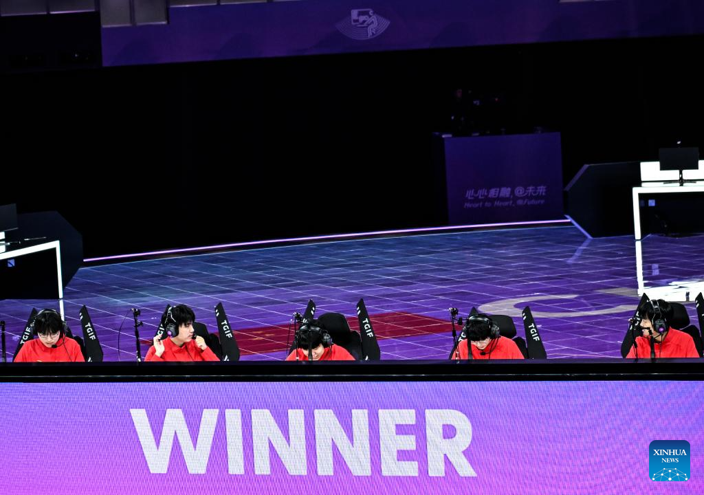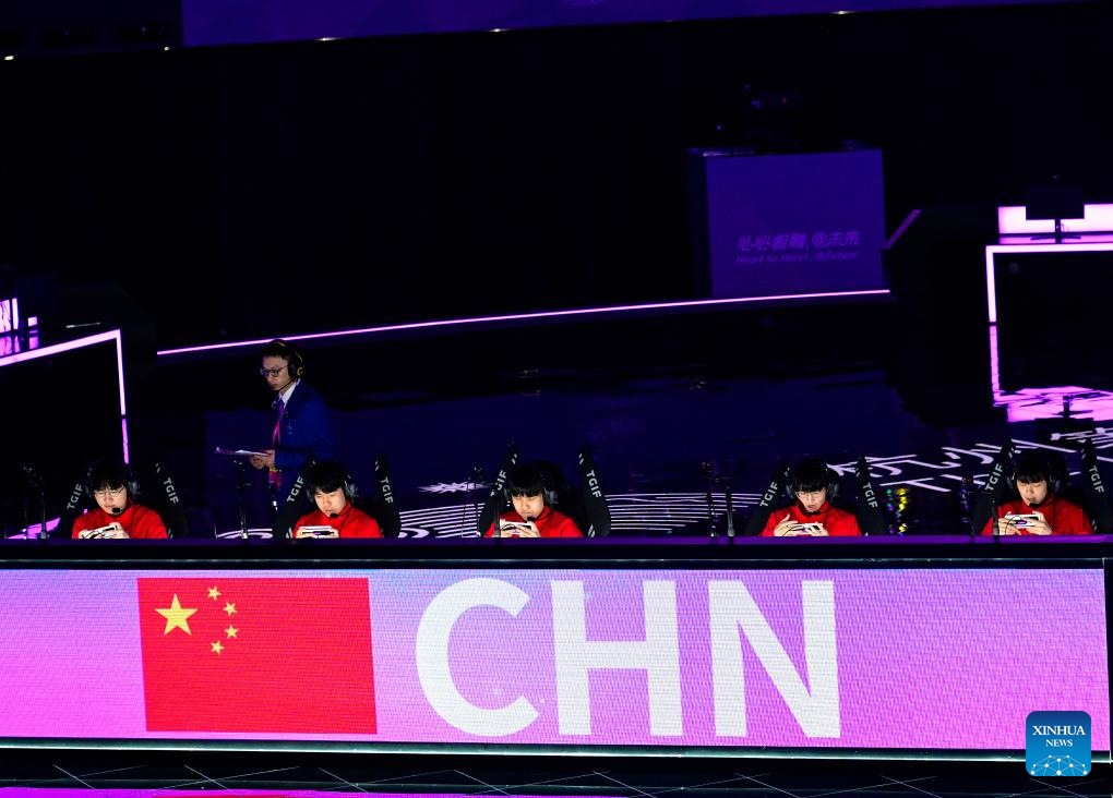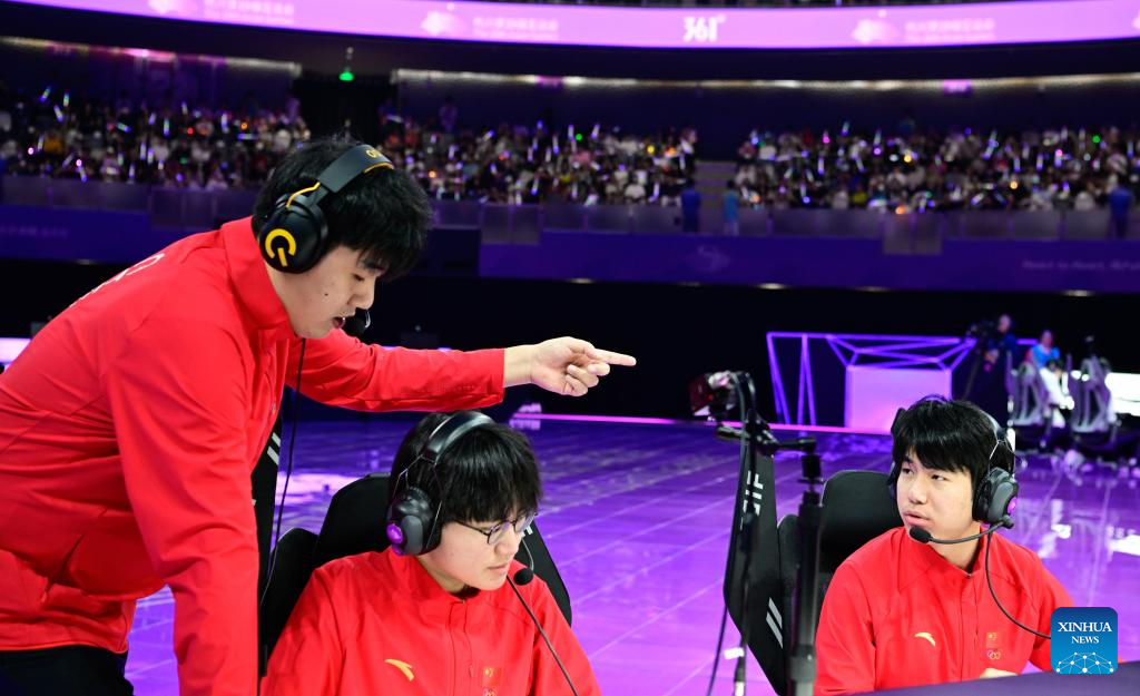 Team China compete during Arena of Valor Asian Games Version Semifinal of Esports at the 19th Asian Games in Hangzhou, east China's Zhejiang Province, Sept. 25, 2023. (Xinhua/Yan Linyun)
