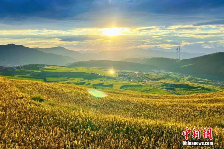 An abandoned quarry turned rice field enters harvest season with wind turbines at the background, forming a unique landscape in Hezhou, south China's Guangxi Zhuang Autonomous Region. (Photo: China News Service/Deng Jingzi)