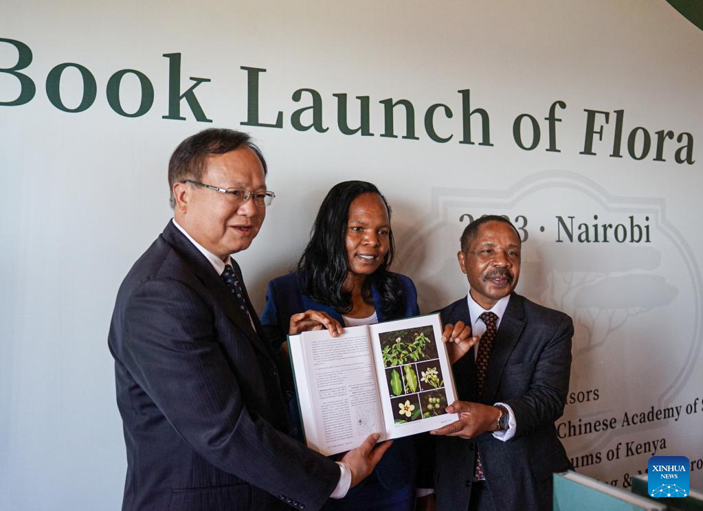 Wang Qingfeng (L), director of the Wuhan Botanical Garden of the Chinese Academy of Sciences, Mary Gikungu (C), the director-general of the National Museums of Kenya, and Geoffrey Mwachala, the chief scientist at the National Museums of Kenya and editor-in-chief of the Flora of Kenya publication, attend a book launch of the 23rd volume "Rubiaceae" of the Flora of Kenya in Nairobi, Kenya, on Sept. 25, 2023. (Xinhua/Li Yahui)