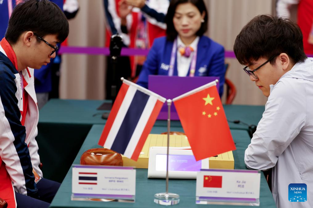 Ke Jie (R) of China competes against Pongsakarn Sornarra of Thailand during the Men's Individual Preliminary Round of Go Chess at the 19th Asian Games in Hangzhou, east China's Zhejiang Province, Sept. 26, 2023. (Xinhua/Gong Bing)
