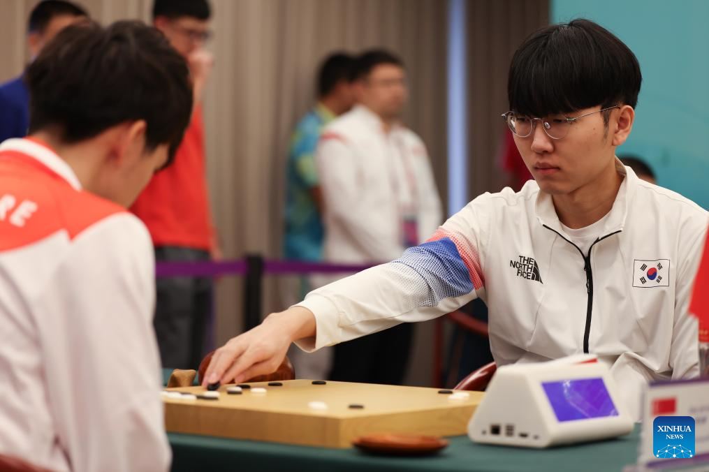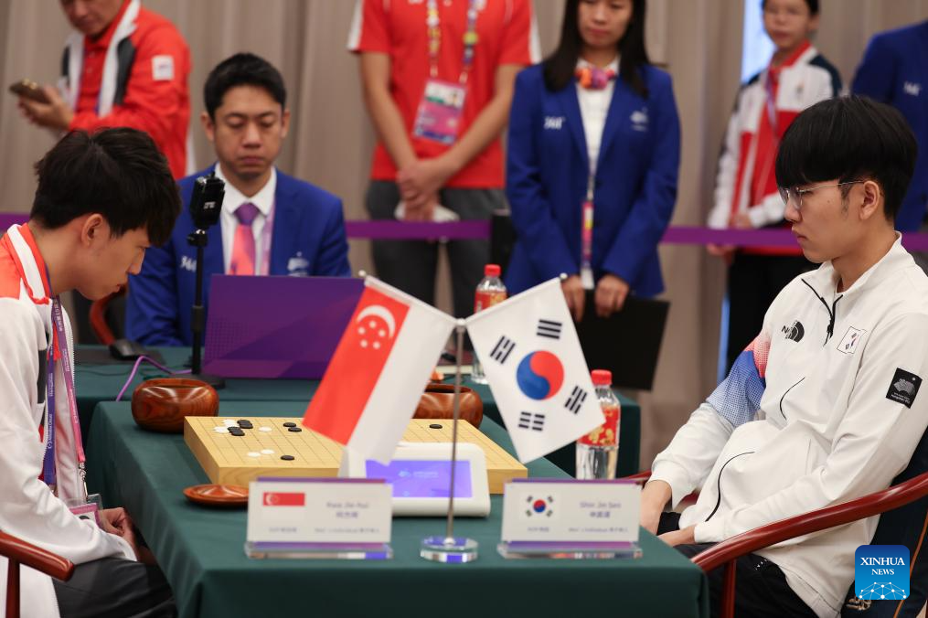 Shin Jinseo (R) of South Korea competes against Kwa Jie Hui of Singapore during the Men's Individual Preliminary Round of Go Chess at the 19th Asian Games in Hangzhou, east China's Zhejiang Province, Sept. 26, 2023. (Xinhua/Gong Bing)