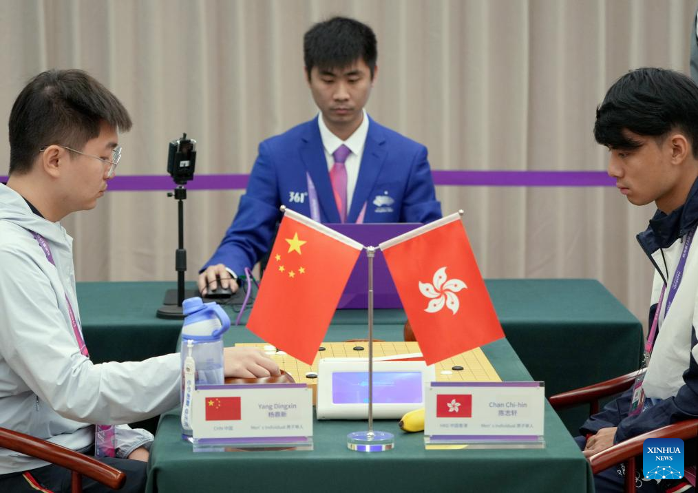 Yang Dingxin (L) of China competes against Chan Chi Hin of China's Hong Kong during the Men's Individual Preliminary Round of Go Chess at the 19th Asian Games in Hangzhou, east China's Zhejiang Province, Sept. 25, 2023. (Xinhua/Han Chuanhao)