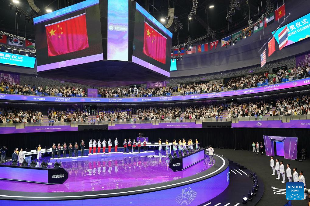 An awarding ceremony is held after the Arena of Valor Asian Games Version Final match of Esports at the 19th Asian Games in Hangzhou, east China's Zhejiang Province, Sept. 26, 2023. (Xinhua/Han Chuanhao)