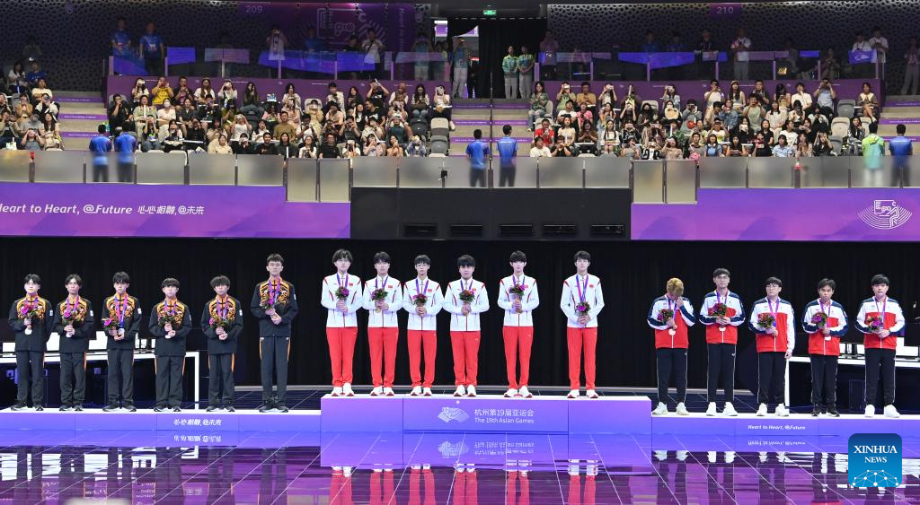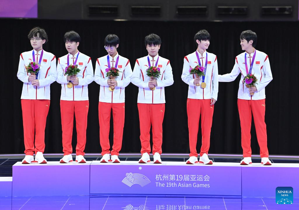 Gold Medalists of team China attend the awarding ceremony for the Arena of Valor Asian Games Version of Esports at the 19th Asian Games in Hangzhou, east China's Zhejiang Province, Sept. 26, 2023. (Xinhua/Yan Linyun)
