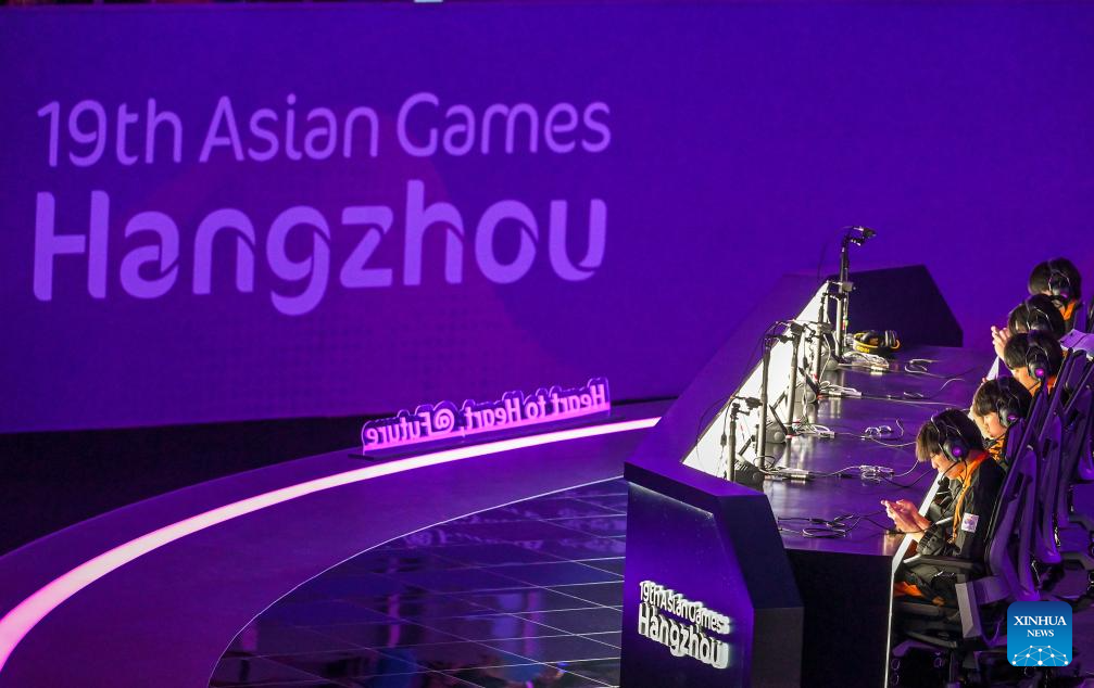 Players of team China compete during the Arena of Valor Asian Games Version Final match of Esports at the 19th Asian Games in Hangzhou, east China's Zhejiang Province, Sept. 26, 2023. (Xinhua/Han Chuanhao)