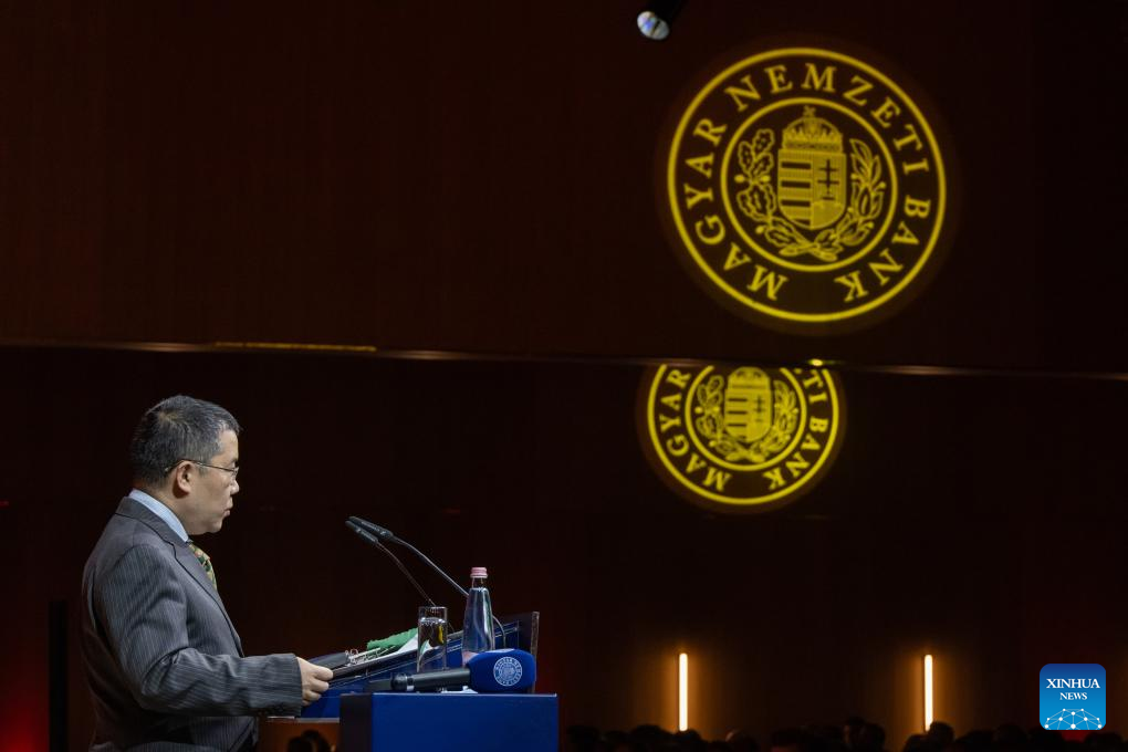 Chinese Ambassador to Hungary Gong Tao addresses a seminar marking the 10th anniversary of the Belt and Road Initiative (BRI), in Budapest, Hungary, on Sept. 25, 2023. (Photo by Attila Volgyi/Xinhua)