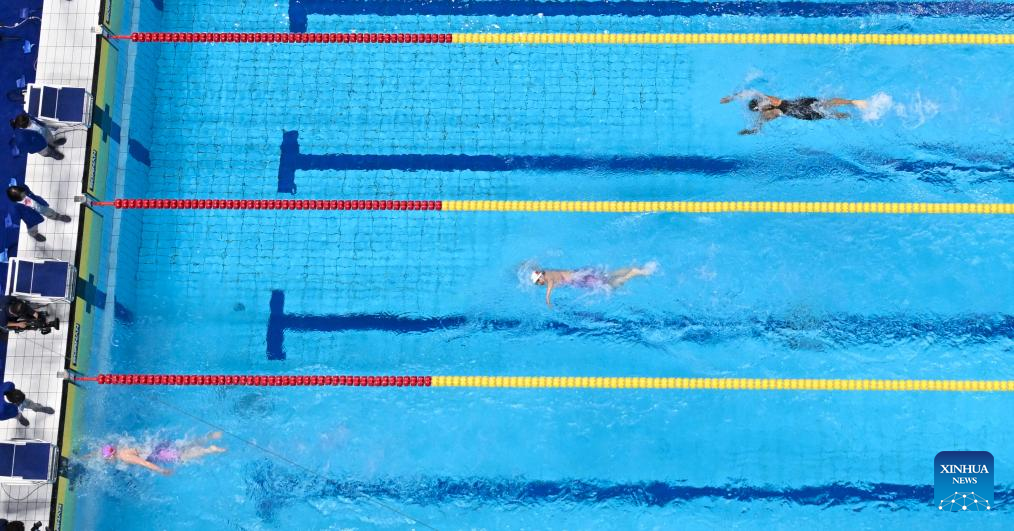 Li Bingjie (bottom) and Ma Yonghui (C) of China compete during the women's 400m freestyle final at the 19th Asian Games in Hangzhou, east China's Zhejiang Province, Sept. 26, 2023. (Xinhua/Xia Yifang)