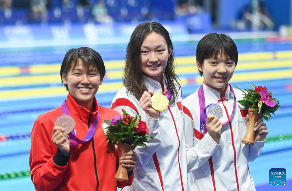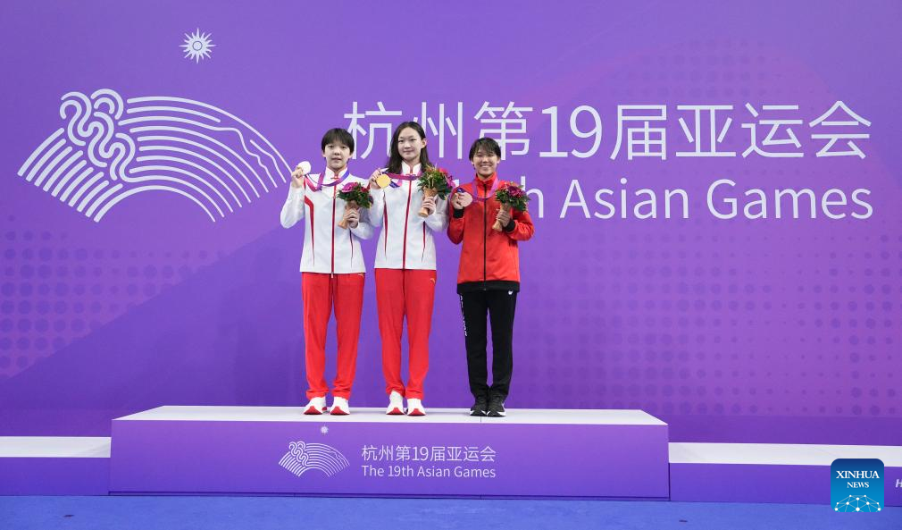(From L-R) Silver medallist Ma Yonghui of China, gold medallist Li Bingjie of China and bronze medallist Kobori Waka of Japan attend the awarding ceremony of the women's 400m freestyle swimming at the 19th Asian Games in Hangzhou, east China's Zhejiang Province, Sept. 26, 2023. (Xinhua/Xue Yuge)
