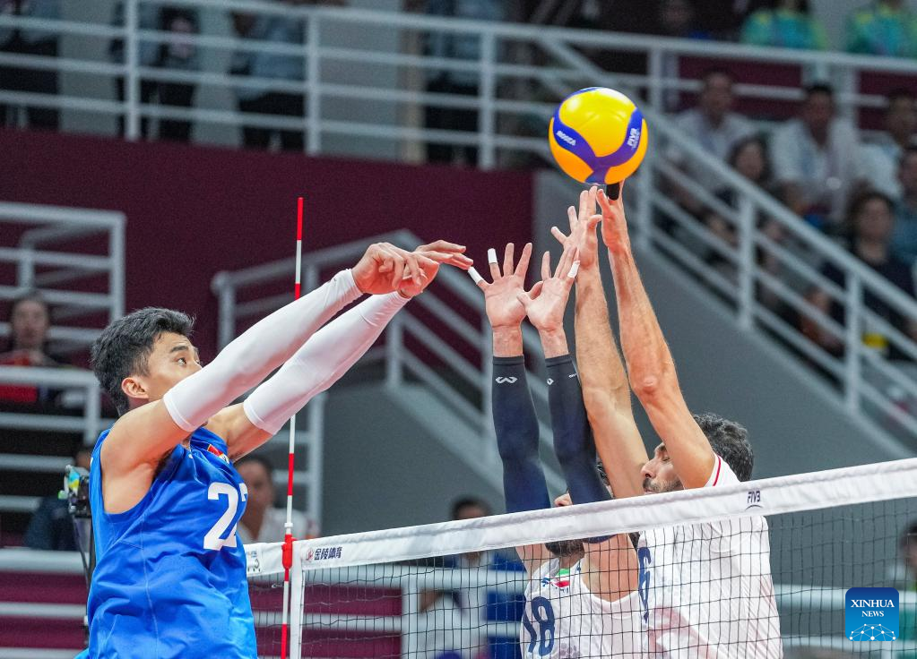 Amirhossein Esfandiar (1st R) of Iran competes during the Volleyball Men's Gold Medal Match between China and Iran at the 19th Asian Games in Hangzhou, east China's Zhejiang Province, Sept. 26, 2023. (Xinhua/Sun Fei)