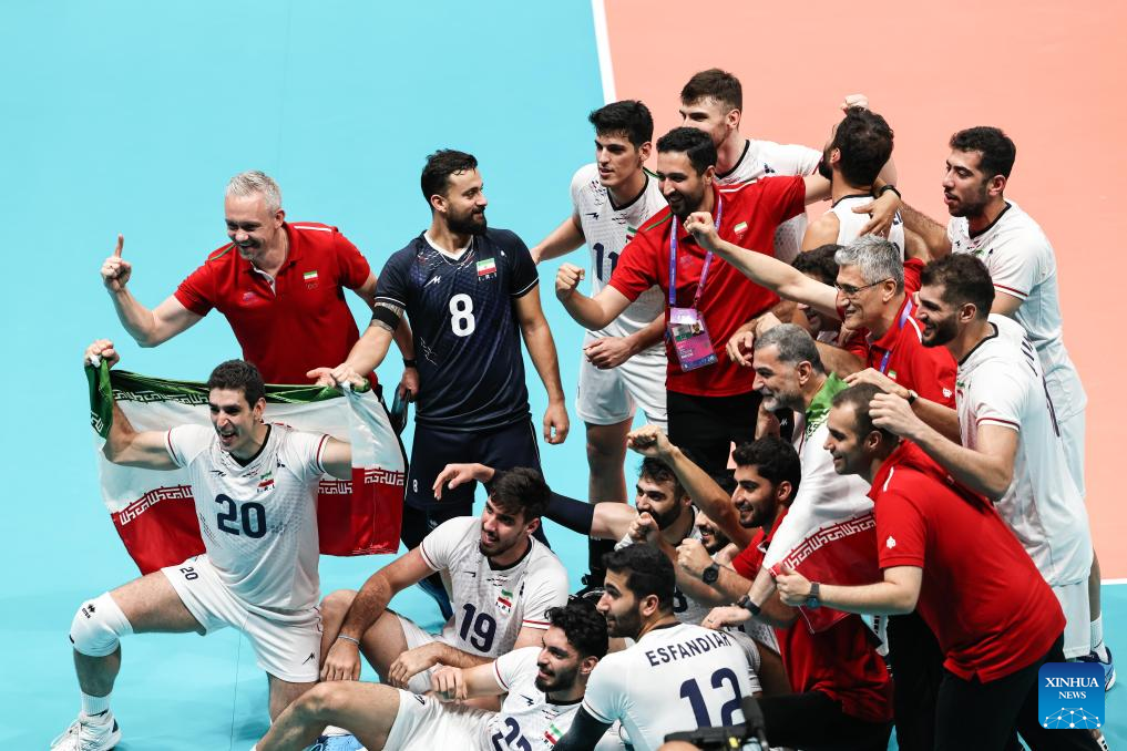 Team Iran celebrate after the gold medal match of volleyball between China and Iran at the 19th Asian Games in Hangzhou, east China's Zhejiang Province, Sept. 26, 2023. (Xinhua/Zhu Zheng)