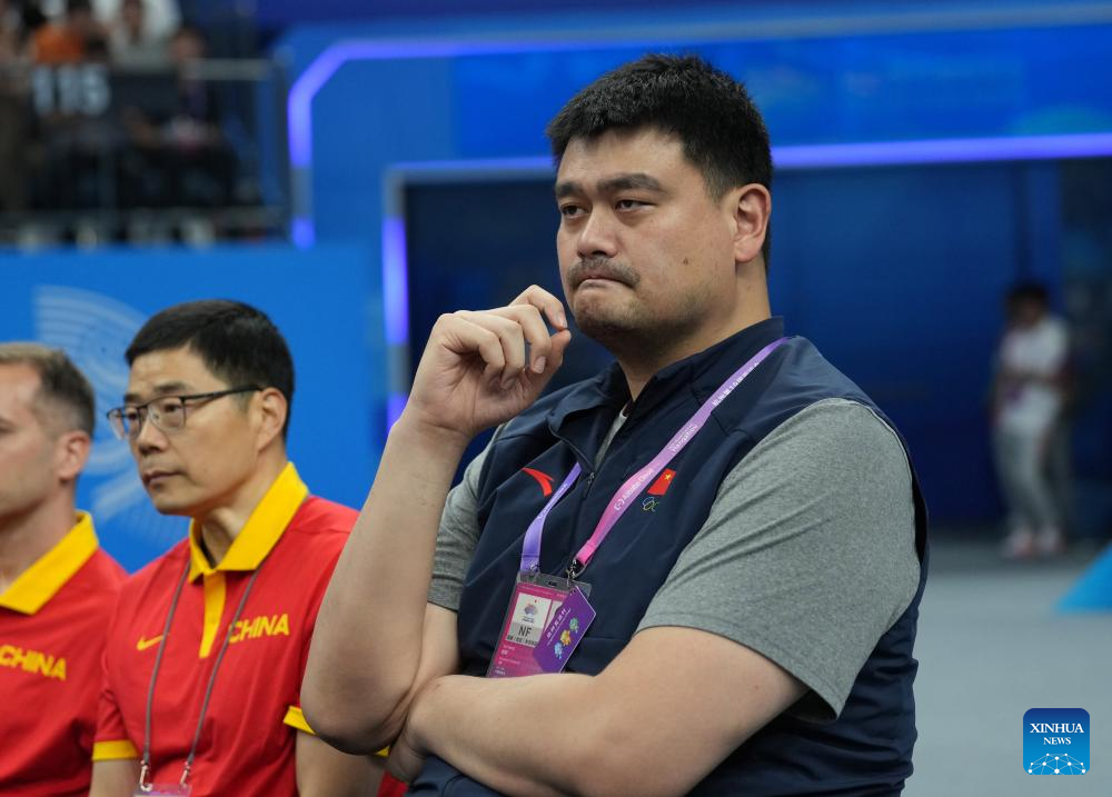 Chinese Basketball Association president Yao Ming (R) watches the Men's Preliminary Round match of Basketball between China and Mongolia at the 19th Asian Games in Hangzhou, east China's Zhejiang Province, Sept. 26, 2023. (Xinhua/Meng Yongmin)