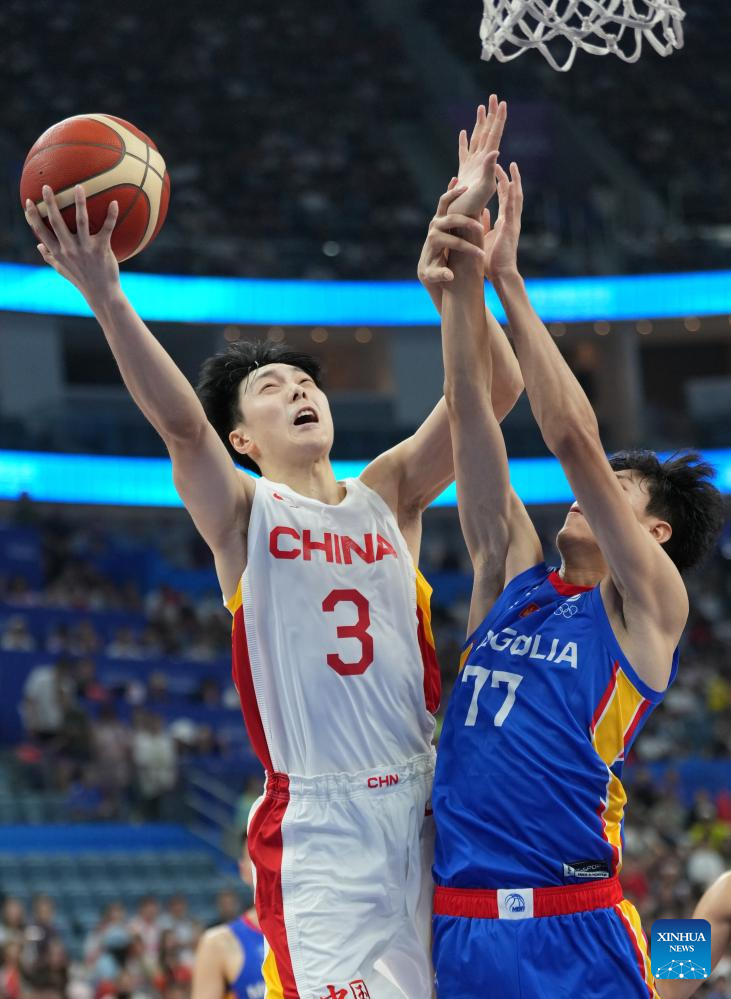 Zhang Zhenlin (C) of China competes during the Men's Preliminary Round match of Basketball between China and Mongolia at the 19th Asian Games in Hangzhou, east China's Zhejiang Province, Sept. 26, 2023. (Xinhua/Pan Yulong)