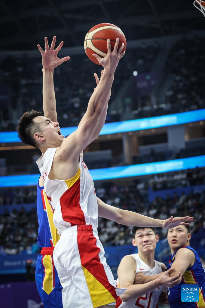 Cui Yongxi (front) of China competes during the Men's Preliminary Round match of Basketball between China and Mongolia at the 19th Asian Games in Hangzhou, east China's Zhejiang Province, Sept. 26, 2023. (Xinhua/Meng Yongmin)