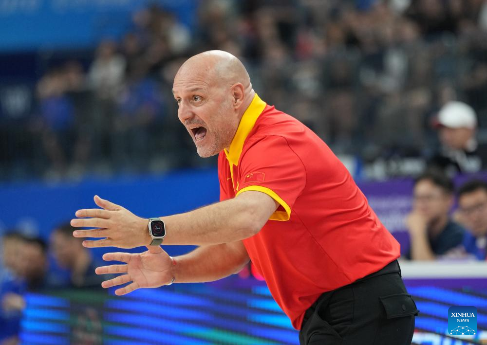 Aleksandar Djordjevic, head coach of China, reacts during the Men's Preliminary Round match of Basketball between China and Mongolia at the 19th Asian Games in Hangzhou, east China's Zhejiang Province, Sept. 26, 2023. (Xinhua/Meng Yongmin)