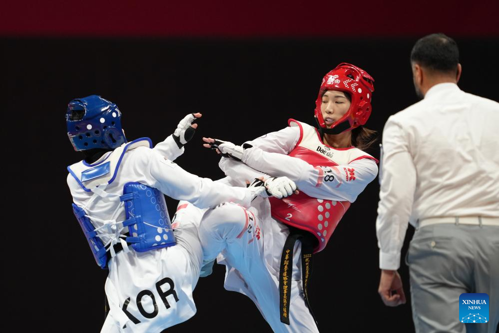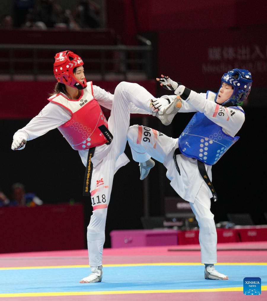 Park Hyejin (R) of South Korea competes with Lin Wei Chun of Chinese Taipei during the Women's 53kg Gold Medal Contest of Taekwondo between South Korea and Chinese Taipei at the 19th Asian Games in Hangzhou, east China's Zhejiang Province, Sept. 26, 2023. (Xinhua/Jiang Wenyao)