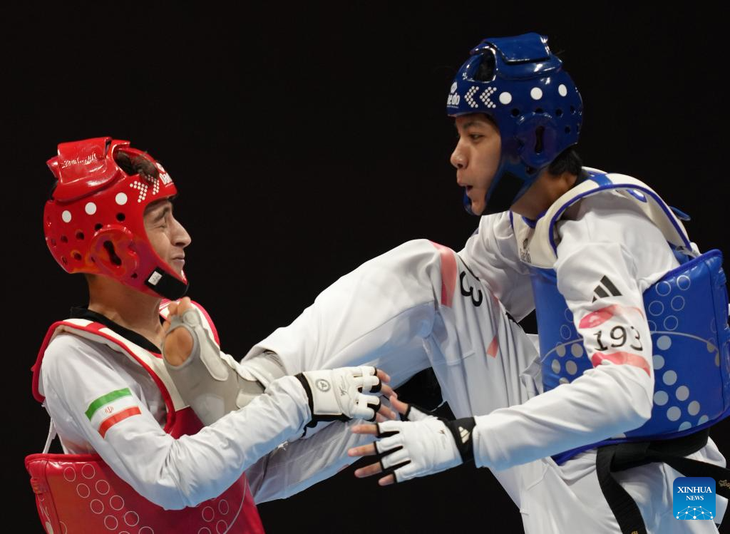 Banlung Tubtimdang (R) of Thailand competes with Alireza Hosseinpour of Iran during the Taekwondo Men's 63kg Gold Medal Contest at the 19th Asian Games in Hangzhou, east China's Zhejiang Province, Sept. 26, 2023. (Xinhua/Jiang Wenyao)