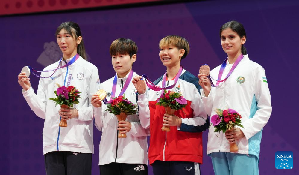 Luo Zongshi (2nd L) of China, Lo Chia Ling (1st L) of Chinese Taipei, Kim Yujin (3rd L) of South Korea and Harnsujin Phannapa of Thailand pose during the awarding ceremony of the Women's 57kg of Taekwondo at the 19th Asian Games in Hangzhou, east China's Zhejiang Province, Sept. 26, 2023. (Xinhua/Jiang Wenyao)