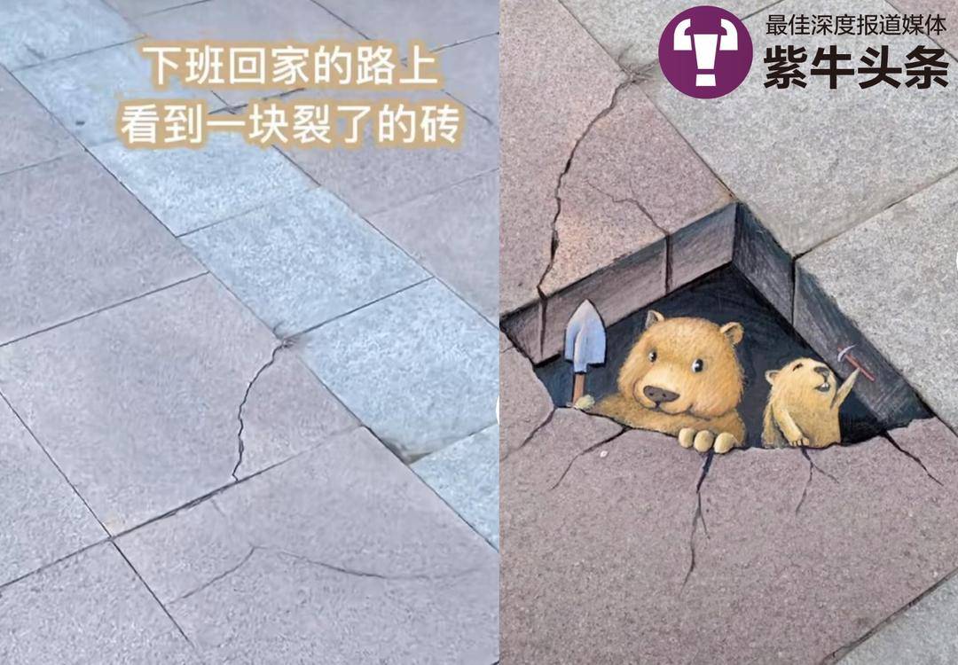 Thanks to her ingenuity, citizens in east China's Shanghai may be pleasantly surprised when they see lovely cartoons in unexpected places: a curious bear and mouse peek out of a crack in broken pavement bricks, as if they lived in a cave below; a little green person stands on a road, with the grass in a gap between the nearby floor bricks being the person's hair; a hamster waters a cluster of purple flowers that have sprouted from the gap between two floor bricks.