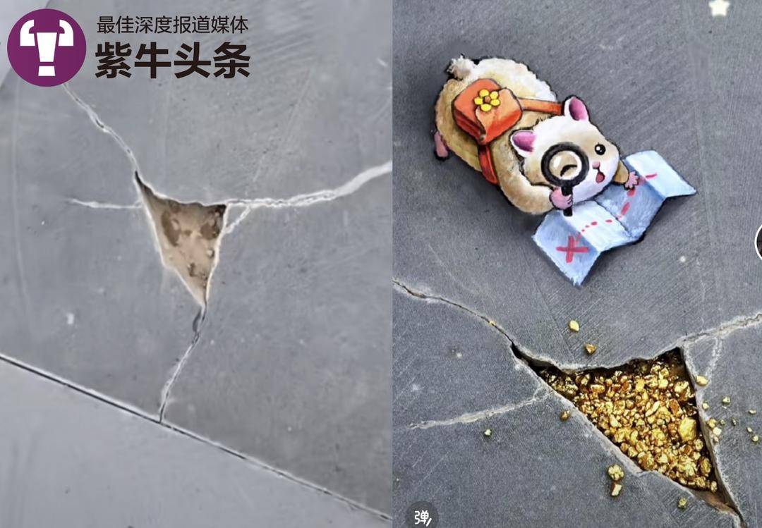 A broken floor brick is turned into a picture of a hamster hunting for treasure by Tang Zixi, a 26-year-old Chinese artist. (Photo courtesy of Tang Zixi)