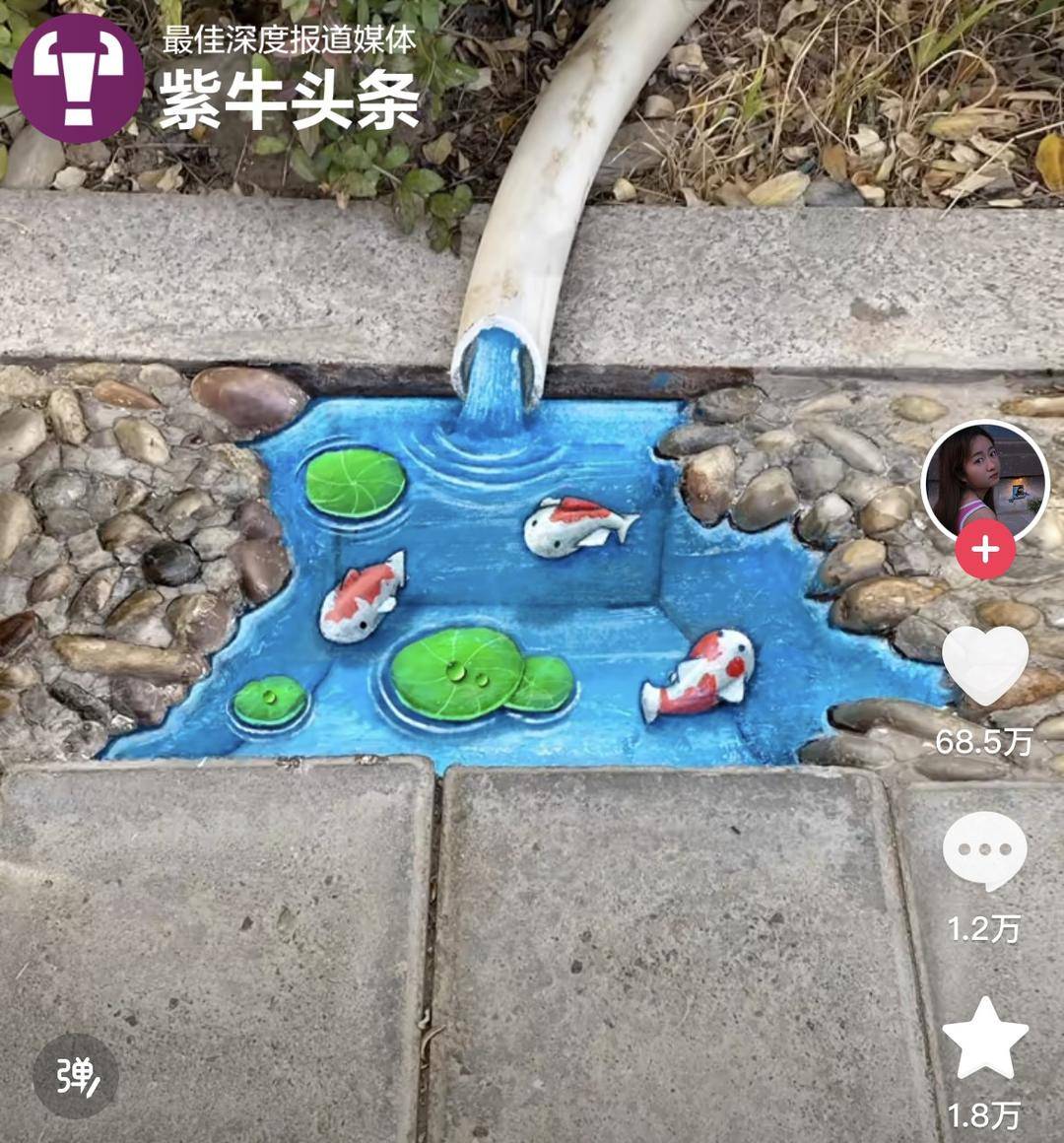 Photo shows a picture of koi fish swimming in a pond created by Tang Zixi, a 26-year-old Chinese artist, at a broken part of a cobblestone ground. (Photo courtesy of Tang Zixi)