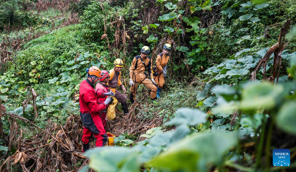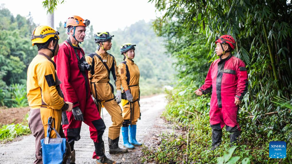 An Italian expert (2nd L) and members of Guizhou provincial mountain resources institute prepare to explore Shuanghe Cave in Suiyang County, southwest China's Guizhou Province, Sept. 24, 2023. (Xinhua/Tao Liang)