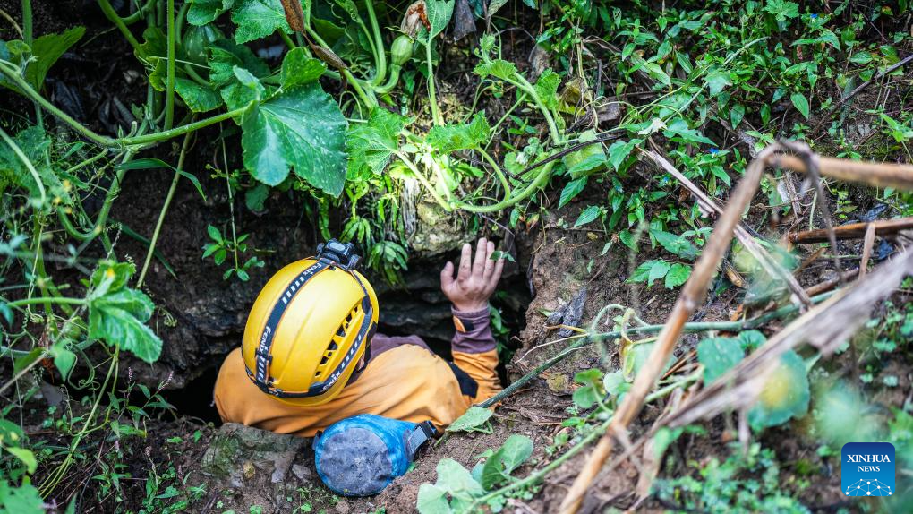 A member of Guizhou provincial mountain resources institute enters a branch cave of Shuanghe Cave in Suiyang County, southwest China's Guizhou Province, Sept. 24, 2023. (Xinhua/Tao Liang)