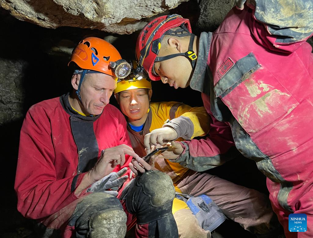 An Italian expert and members of Guizhou provincial mountain resources institute conduct an expedition inside a branch cave of Shuanghe Cave in Suiyang County, southwest China's Guizhou Province, Sept. 24, 2023. (Xinhua/Tao Liang)