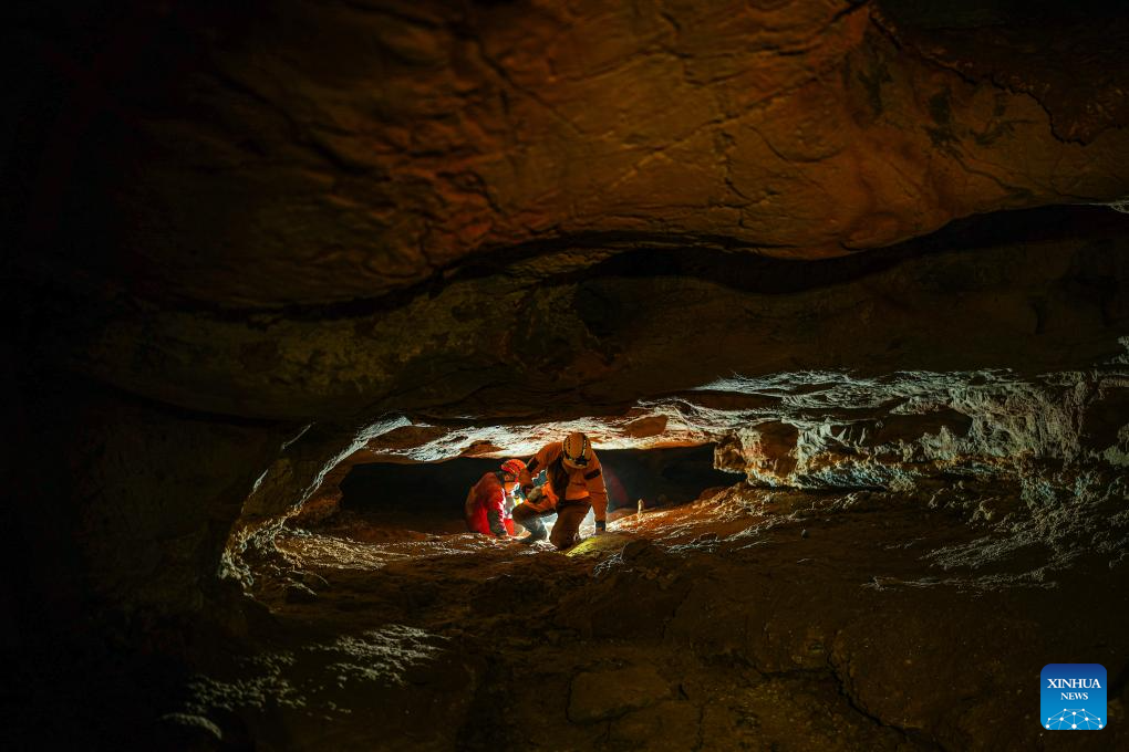 Members of Guizhou provincial mountain resources institute explore a branch cave of Shuanghe Cave in Suiyang County, southwest China's Guizhou Province, Sept. 23, 2023. (Photo by Zhao Fei/Xinhua)