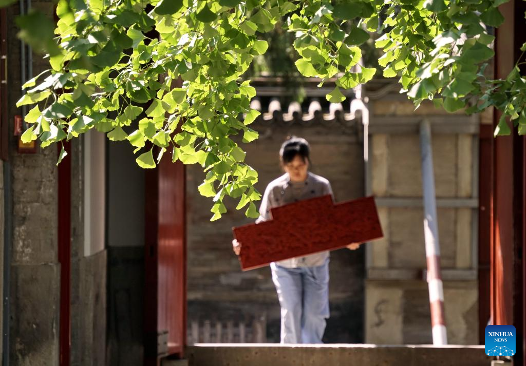 Hai Yan carries a large piece of semi-finished carved lacquer artwork at her studio in the Cheng'en Temple in Beijing, capital of China, Sept. 21, 2023. (Xinhua/Li Xin)