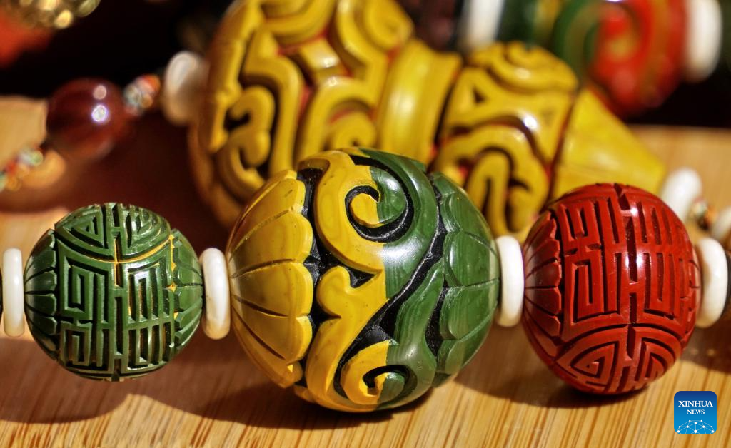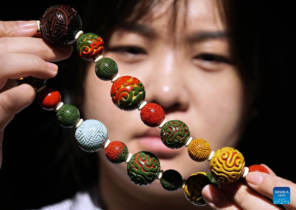 Hai Yan shows carved lacquer bracelets with traditional and modern patterns at her studio in the Cheng'en Temple in Beijing, capital of China, Sept. 21, 2023. (Xinhua/Li Xin)