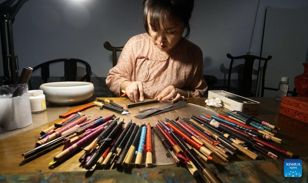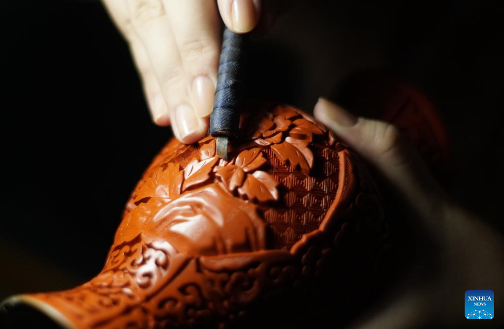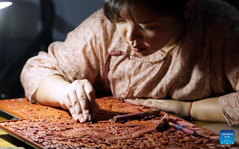 Hai Yan makes a carved lacquer artwork at her studio in the Cheng'en Temple in Beijing, capital of China, Sept. 8, 2023. (Xinhua/Li Xin)