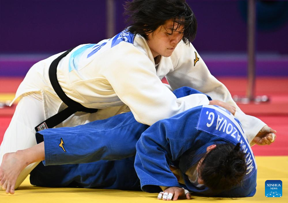 Japan's Tanaka Shiho (L) competes with Uzbekistan's Gulnoza Matniyazova during the Mixed Team Final of Judo at the 19th Asian Games in Hangzhou, east China's Zhejiang Province, Sept. 27, 2023. (Xinhua/Li An)