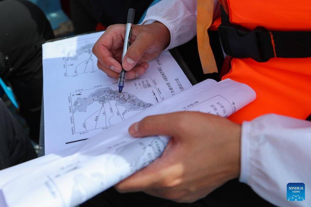 Team member Feng Chen marks the sampling points on a map of Ulan Suhai Lake in Bayannur, north China's Inner Mongolia Autonomous Region, Sept. 15, 2023. (Xinhua/Wang Kaiyan)