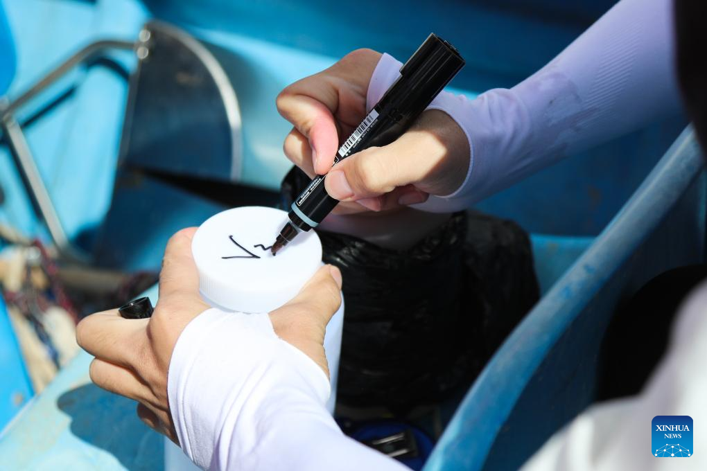 Team member Liu Yinghui marks a bottle of water sample collected from the Ulan Suhai Lake in Bayannur, north China's Inner Mongolia Autonomous Region, Sept. 15, 2023. (Xinhua/Wang Kaiyan)