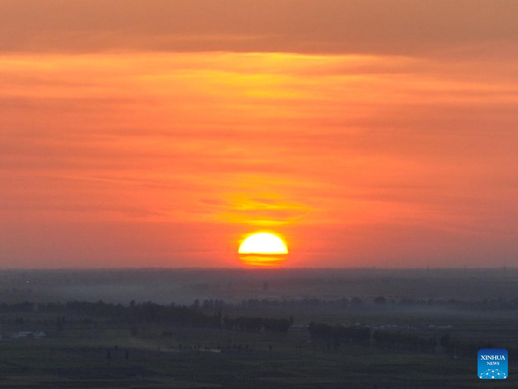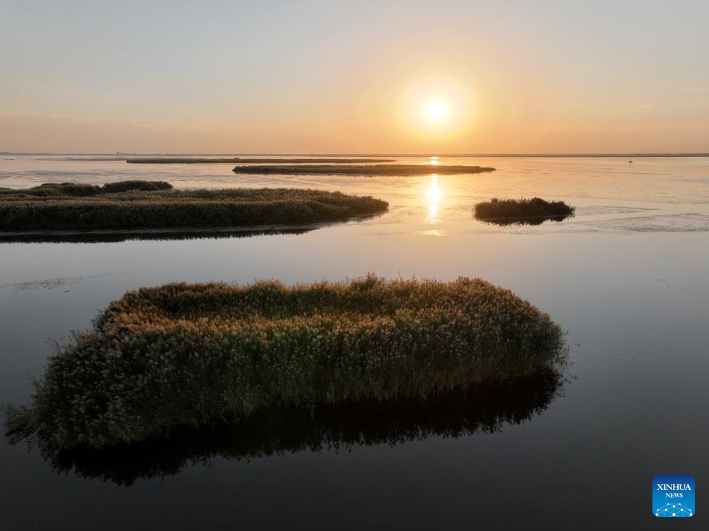 This aerial photo taken on Sept. 13, 2023 shows a scenery of sunset at the Ulan Suhai Lake in Bayannur, north China's Inner Mongolia Autonomous Region. (Xinhua/Xing Guangli)