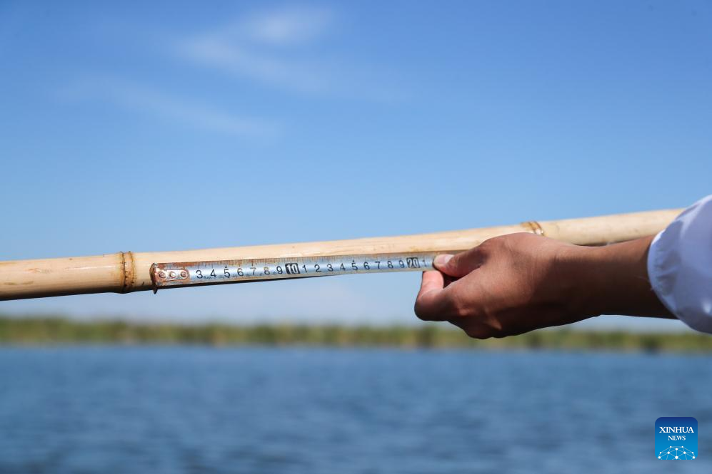 Team member Feng Chen measures the depth of water at an area of the Ulan Suhai Lake in Bayannur, north China's Inner Mongolia Autonomous Region, Sept. 15, 2023. (Xinhua/Wang Kaiyan)