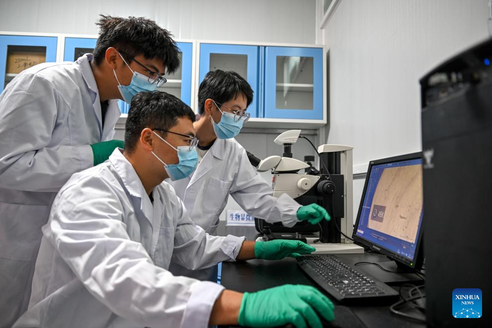 Wu Rong and her fellow students study water samples taken from the Ulan Suhai Lake at a laboratory in Bayannur, north China's Inner Mongolia Autonomous Region, Sept. 14, 2023. (Xinhua/Wang Kaiyan)