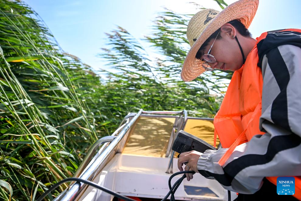 Wu Rong checks the water quality of the Ulan Suhai Lake in Bayannur, north China's Inner Mongolia Autonomous Region, Sept. 15, 2023. (Xinhua/Lian Zhen)